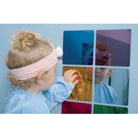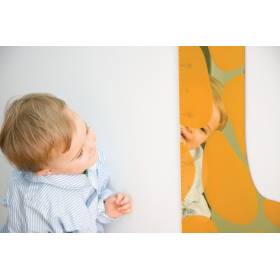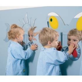 El niño desarrolla su autoestima jugando con el espejo. Observándose con diferentes gestos y posturas, divirtiéndose con sus compañeros de guardería. Espejos fabricados en material acrílico super seguro.