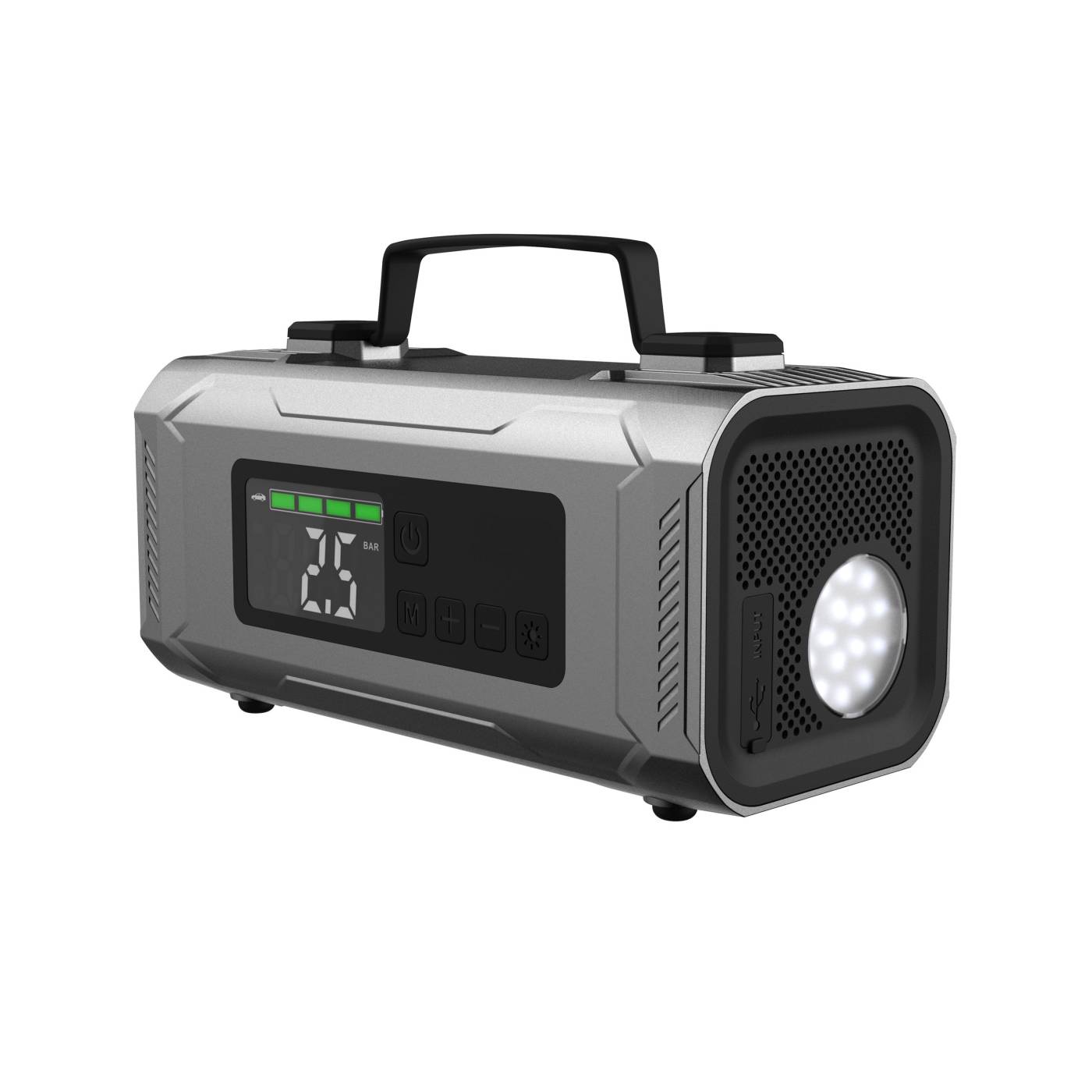 Con una pantalla LED intuitiva y una operación fácil de usar, nuestro compresor viene completo con todos los accesorios necesarios, incluyendo agujas para hinchar balones y pinzas para batería, etc.