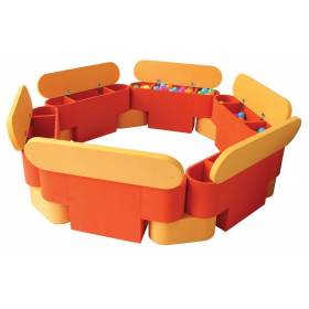 Sistema de parque modular. Acoplando los módulos se pueden realizar piscinas sensoriales de pelotas, parques de juegos, separadores etc... Interior hueco en el que se puede guardar todo tipo de material como pelotas, juguetes…etc. Tapa con bisagras de seguridad. Fabricado en material no tóxico, suave e anti impacto. Máxima seguridad.